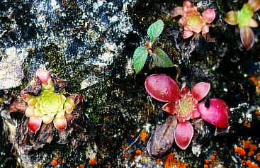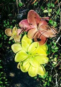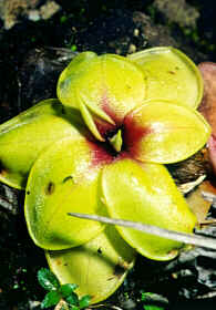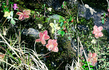 Pinguicula moranensis in habitat, Chiapas; red and green plants are growing in the same habitat | Pinguicula moranensis, green plant with red center, Chiapas, Mexico |