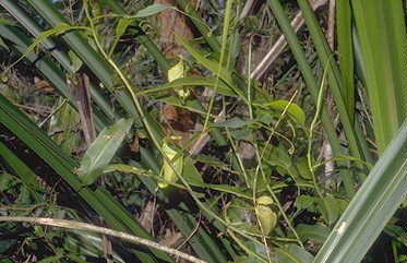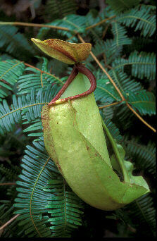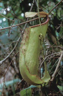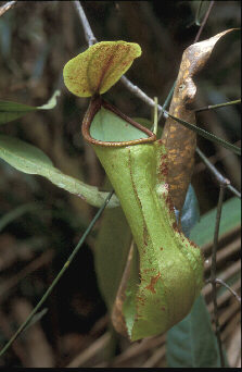 Plant of N. neoguineensis with upper pitchers climbing on Pandanus. |